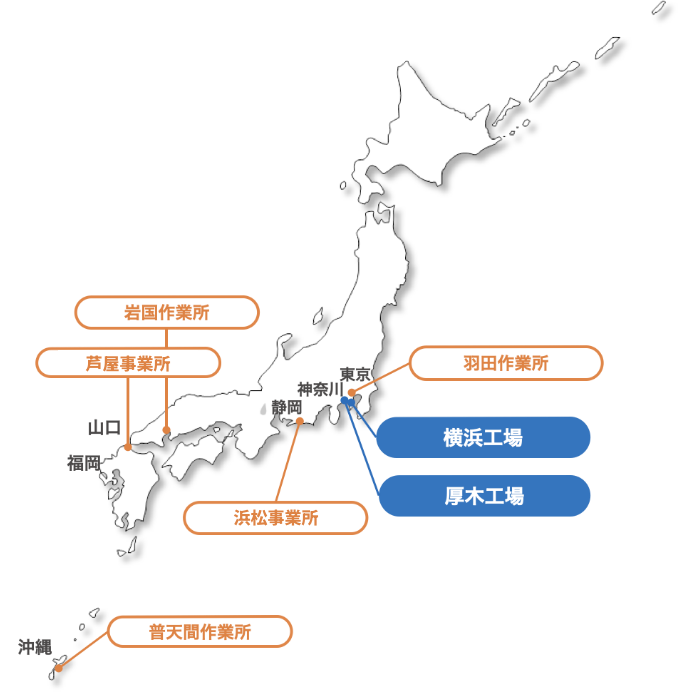 横浜工場・厚木工場のみならず、お客様の元にて整備を行うオンサイト整備を行っており、日本各地幅広く整備を行っております。
